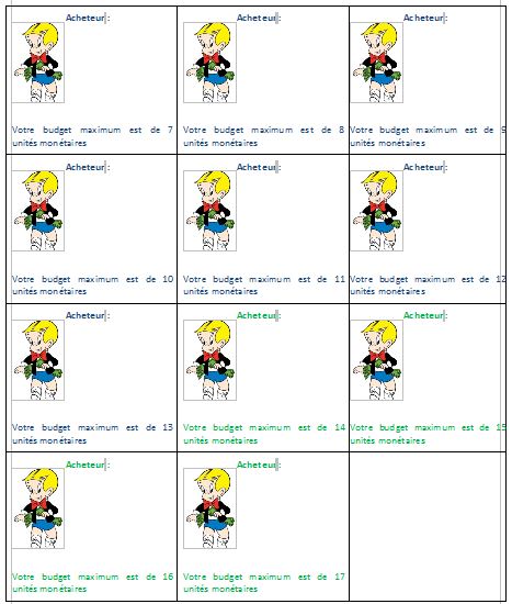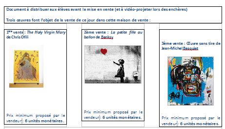 - 18 élèves sont de potentiels acheteurs. Leur budget maximal pour cette vente est fixé par une carte distribuée de manière aléatoire au début de la partie (cf. annexe 1). Chaque acheteur a pour rôle de faire monter les enchères sur les œuvres qu’il souhaite acquérir dans la limite de son budget. Si un acheteur est intéressé par une œuvre, il doit proposer un prix plus élevé d’une unité monétaire (+ 1UM) par rapport au prix de départ ou au prix proposé par un autre acheteur potentiel du bien qu’il l’intéresse. L’acheteur qui fait la meilleure offre acquiert l’œuvre.