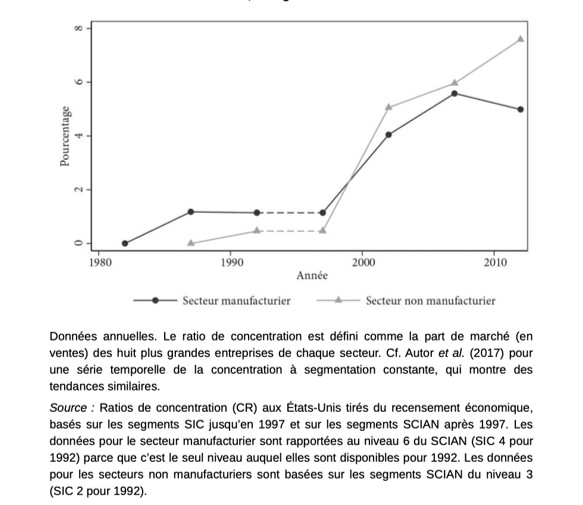 Le document montre clairement que lorsque l’on raisonne sur le ratio de concentration, la concentration du secteur non manufacturier augmente plus vite à partir de la fin des années 1990, par rapport à celle du secteur manufacturier.