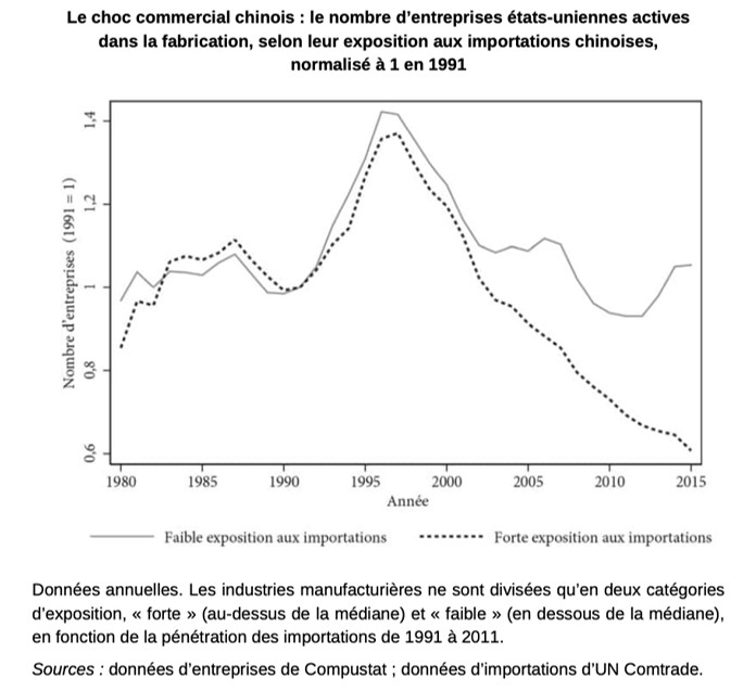 On observe aux États-Unis que l’ouverture commerciale et la concurrence internationale ont conduit, toutes choses égales par ailleurs, à des destructions d’activités et d’emplois plus fortes dans les entreprises manufacturières exposées que dans les industries manufacturières non ouvertes à la concurrence. Cette évolution peut être observée avec l’indicateur base 1 en 1991 qui chute nettement en dessous de 1 (autour de 0,6) en 2015 pour les secteurs fortement exposés aux importations.