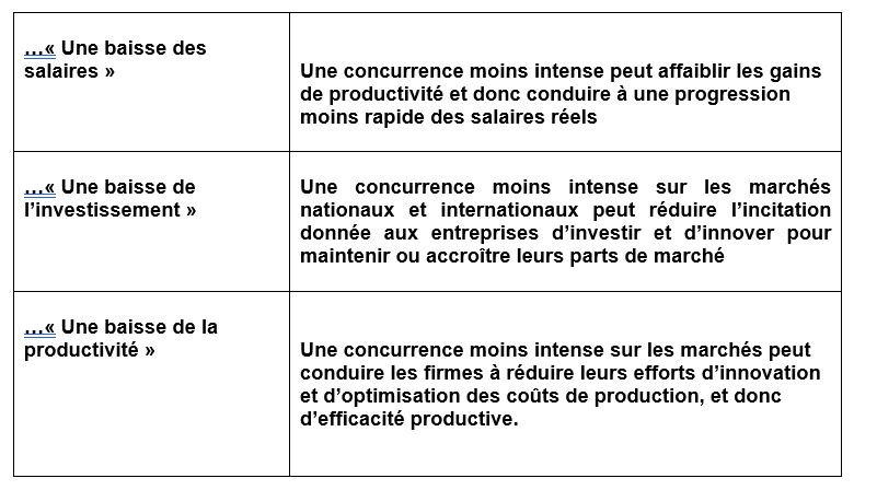 T. Philippon rappelle que la concurrence a un effet direct en libérant du pouvoir d’achat pour le consommateur qui peut acheter des produits plus chers et en plus grande quantité (effet direct), tandis que cette croissance de la demande va ensuite inciter les entreprises à investir, innover et embaucher (effet indirect).
