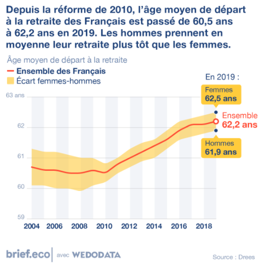 Il s’agit ici de l’âge conjoncturel moyen de départ à la retraite qui permet, selon la Drees, « un suivi rapide de la montée en charge des réformes ».En 2010, la réforme des retraites a relevé de deux ans l’âge de départ à la retraite, le faisant ainsi passer de 60 ans à 62 ans pour le régime général. L’âge moyen de départ à la retraite des Français est ainsi passé de 60,5 ans en 2010 à 62,2 ans en 2019. Il « augmente plus lentement depuis 2016. En effet, le relèvement de l’âge minimum légal d’ouverture des droits achève de produire ses effets », note la Drees.