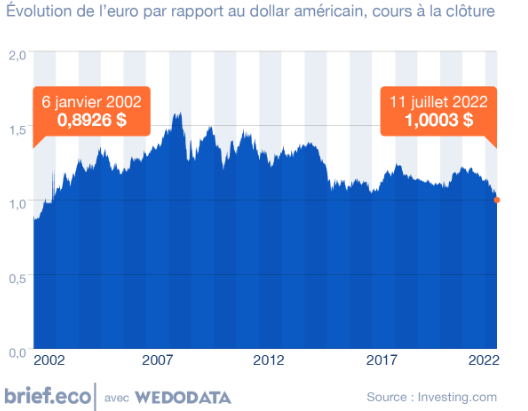 Le cours à la clôture de l’euro face au dollar a atteint lundi son plus bas niveau depuis 2002, année de sa mise en circulation : 1 euro valait 1,0003 dollar. Il est même brièvement tombé mardi dans la journée à la parité parfaite (1 euro = 1 dollar). La valeur de l’euro face au dollar baisse de manière quasi continue depuis mai 2021, date à laquelle un euro permettait d’acheter plus de 1,2 dollar.Cependant, ce phénomène correspond moins à une dépréciation de l’euro qu’à une appréciation du dollar. « La combinaison d’inflation élevée et d’instabilité géopolitique a stimulé la demande » de dollars, qui reste « la monnaie de réserve internationale » et un « actif refuge », expliquait Stéphane Monier, directeur des investissements de la banque privée suisse Lombard Odier, dans une étude réalisée en mai. Les investisseurs sont également séduits par la politique monétaire menée par la Fed, qui a pris des mesures plus rapides et plus fortes que la Banque centrale européenne dans la lutte contre l’inflation. Lorsqu’une devise se déprécie, les produits destinés à l’export deviennent moins chers pour les acheteurs étrangers ; les entreprises exportatrices de la zone euro sont ainsi censées bénéficier de la baisse de l’euro. En revanche, les produits étrangers, qui sont le plus souvent achetés en dollars, deviennent mécaniquement plus coûteux, ce qui a pour conséquence d’alimenter l’inflation en Europe.
