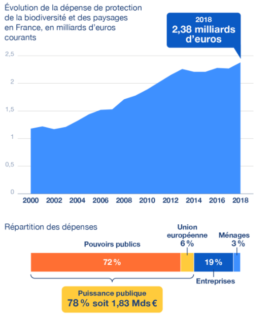 Entre 2000 et 2018, il a progressé d’environ 4 % par an.Les dépenses prises en compte couvrent plusieurs domaines tels que la gestion des zones protégées (création de nouvelles zones, lutte contre les espèces exotiques envahissantes, etc.) et la réduction des pressions sur les milieux naturels (dépenses de prévention des dommages causés par l’industrie et les transports, etc.).