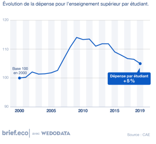 La DIE regroupe toutes les dépenses effectuées, sur le territoire national, pour les activités d’éducation et les activités connexes (administration, repas, manuels, etc.) par l’ensemble des agents économiques, c’est-à-dire par les ménages, les entreprises et l’État.Le CAE note une « baisse tendancielle » de la dépense par étudiant « depuis les années 2010 ».
