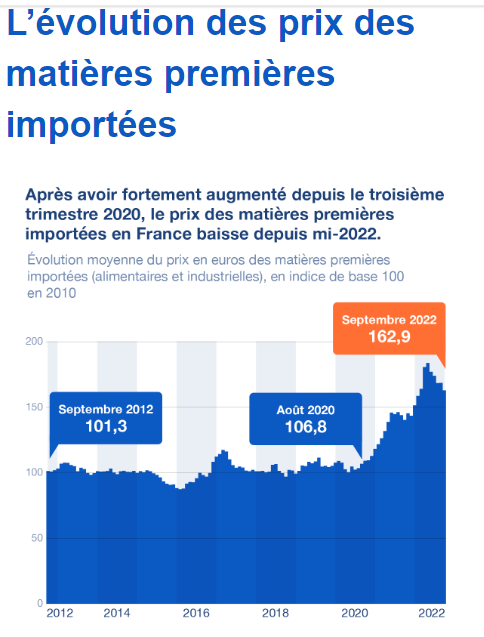 Après avoir fortement augmenté depuis le troisième trimestre 2020, le prix en euros des matières premières importées (alimentaires et industrielles) en France baisse depuis avril 2022, selon une étude récente de l’institut national de statistiques Insee. Le prix en euros du pétrole recule aussi depuis juin .En septembre 2022, les prix des matières premières importées demeurent cependant à un niveau élevé. Par rapport à leurs niveaux d’octobre 2019, le prix des matières premières alimentaires est supérieur de 70,2 %, celui des matières premières industrielles de 41,1 % et celui du pétrole de 67,8 %. Cette hausse des prix est en partie liée à la pandémie de Covid-19, qui a débuté en novembre 2019 en Chine. L’augmentation des prix des matières premières importées se répercute sur les prix de détail et entraîne une augmentation de l’inflation en France, qui a atteint en octobre 6,2 % sur un an, selon l’Insee.Malgré cette baisse récente des prix, le cabinet d’études Asterès estime dans une note que l’inflation pourrait se maintenir à un niveau élevé jusqu’au début de 2023 avant de baisser progressivement. Il explique que la hausse des prix produit un effet « boule de neige » qui entretient l’inflation « même lorsque ses causes premières se sont dissipées », parce qu’elle oriente les salaires à la hausse, en particulier le SMIC qui est indexé sur l’inflation.