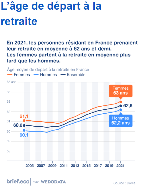 En 2021, les personnes résidant en France partaient à la retraite en moyenne à 62 ans et sept mois, selon des statistiques récentes de la la Drees, la direction des études du ministère de la Santé. L’âge moyen de départ a reculé depuis 2004, date à laquelle il se situait à 60 ans et demi. La Drees précise que ce recul est essentiellement dû à la réforme des retraites de 2010, qui a fait passer l’âge légal de départ à la retraite de 60 ans à 62 ans.Aujourd’hui, l’âge légal de départ (l’âge d’ouverture des droits) est de 62 ans, mais il est nécessaire de cotiser pendant un certain nombre de trimestres (166 à 168 actuellement, selon l’année de naissance) pour obtenir une retraite à taux plein, c’est-à-dire une pension sans décote. Cette durée de cotisation requise incite les personnes ayant commencé à travailler après avoir fait des études supérieures à poursuivre leur activité au-delà de l’âge légal. La nouvelle réforme des retraites promulguée mi-avril va progressivement faire passer cet âge légal de départ à 64 ans. Elle prévoit aussi d’augmenter progressivement le nombre de trimestres cotisés pour partir à taux plein pour arriver à 172 pour les personnes nées à partir de 1965.En 2021, les femmes partaient à la retraite à 63 ans en moyenne, soit 10 mois plus tard que les hommes. Dans une publication de mars, la Caisse nationale d’assurance vieillesse explique que les hommes quittent plus tôt la vie active en France, car « ils sont plus nombreux à pouvoir bénéficier de retraites anticipées ». Dans une fiche de 2021, la Drees affirmait que « bien que les femmes partent à la retraite en moyenne après les hommes, elles vivent plus longtemps, de sorte que leur durée espérée de retraite est supérieure ».