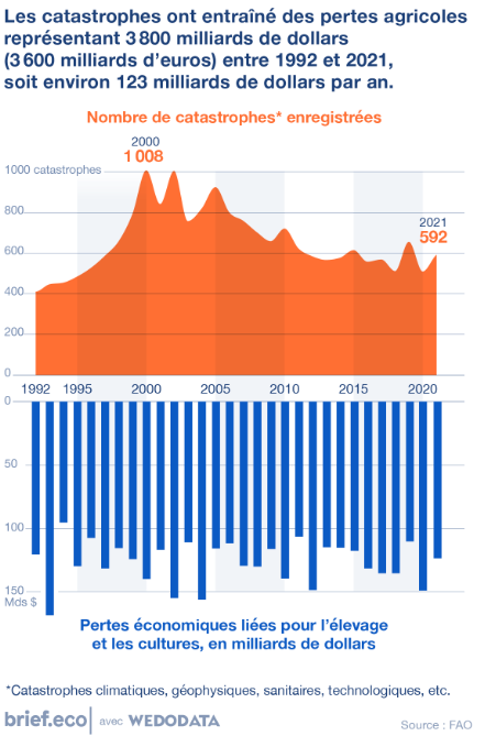 Entre 1992 et 2021, les catastrophes ont entraîné des pertes s’élevant à 3 800 milliards de dollars américains (3 600 milliards d’euros) pour l’élevage et les cultures agricoles, selon un récent rapport de la FAO, l’agence de l’ONU pour l’alimentation et l’agriculture. Ce montant correspond à des pertes moyennes de 123 milliards de dollars par an, soit environ 5 % du PIB agricole mondial annuel (valeur de la production). Les catastrophes sont aussi bien d’ordre climatique (sécheresses, ouragans, etc.), que sanitaires (pandémies, etc.) ou encore dites « technologiques » (marées noires, etc). Selon le rapport, l’Asie est de loin le continent où le niveau des pertes économiques totales est le plus élevé, suivie par l’Afrique, l’Europe et l’Amérique. Les pertes sont plus importantes dans les pays à revenu élevé et à revenu intermédiaire. Toutefois, c’est dans les pays à faible revenu que les pertes en proportion de la valeur ajoutée agricole sont les plus importantes.