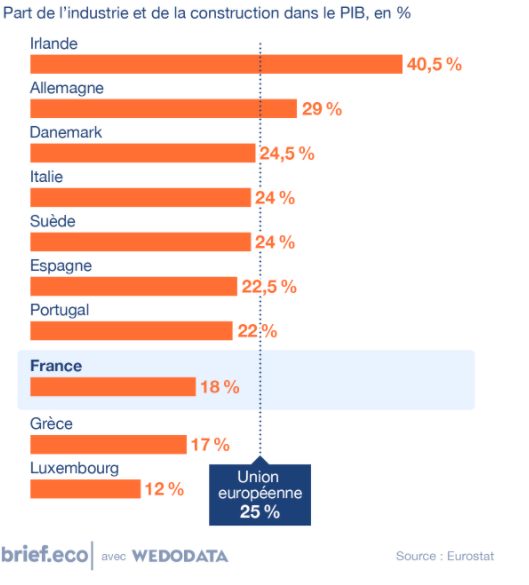 En 2020, le secteur secondaire, c’est-à-dire l’industrie et la construction, a représenté 25 % du PIB de l’UE, selon une étude récente de l’institut européen de statistiques Eurostat.