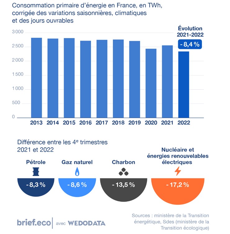 La consommation d’énergie primaire, toutes énergies confondues (nucléaire, énergies renouvelables, charbon, gaz naturel, pétrole), a fortement baissé en France en 2022. Corrigée des variations saisonnières, climatiques et des jours ouvrables, elle s’est rétractée de 8,4 % l’an dernier par rapport à 2021, selon les données du service statistiques du ministère de la Transition écologique (Sdes) actualisées vendredi dernier. Cette consommation a particulièrement chuté au quatrième trimestre 2022, dans un contexte de hausse des prix de l’énergie, liée à la guerre en Ukraine, et d’appels du gouvernement à la « sobriété énergétique ». La consommation d’énergie primaire a ainsi diminué de 12,6 % entre le quatrième trimestre 2021 et le quatrième trimestre 2022, selon une publication récente du ministère de la Transition énergétique. Cette baisse s’observe pour toutes les sources d’énergie, mais elle est particulièrement prononcée pour le nucléaire et les énergies renouvelables utilisées pour produire de l’électricité (photovoltaïque, éolien, hydraulique) : la consommation de ces énergies – les principales sources d’électricité – a diminué de 17,2 % sur un an entre le quatrième trimestre 2021 et la même période l’an dernier. RTE, le gestionnaire du réseau de transport d’électricité en France, avait expliqué en janvier la forte baisse de la consommation d’électricité à la fin de l’année dernière par les « gestes de sobriété » des consommateurs et par une baisse de la production des entreprises.