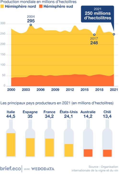 La France perd une place et devient le troisième producteur mondial. La baisse historique de la production de ces pays est un peu compensée par une hausse de celle des États-Unis et des pays de l’hémisphère sud, en particulier du Chili et de l’Australie, qui ont bénéficié de conditions météorologiques relativement favorables. La production de vin est dépendante des conditions météorologiques ainsi que du réchauffement climatique.