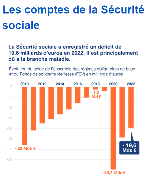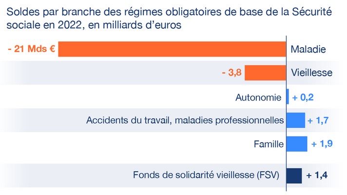 Le déficit de la Sécurité sociale a atteint 19,6 milliards d’euros en 2022, selon un récent bilan publié par la direction de la Sécurité sociale, une administration publique qui dépend à la fois du ministère de la Santé et du ministère de l’Économie. Ce déficit est « légèrement plus dégradé que ce qui était prévu » par la loi de financement de la Sécurité sociale (-18,9 milliards d’euros attendus). En diminution constante depuis 2010, le déficit de la Sécurité sociale a enregistré un record historique en 2020, à -39,7 milliards d’euros, en raison de la crise liée à la pandémie de Covid-19. Celle-ci a entraîné une forte hausse des dépenses et un net recul des recettes (cotisations et prélèvements obligatoires). Le déficit s’est réduit de moitié entre 2020 et 2022. En 2022, parmi les cinq branches qui composent la Sécurité sociale, deux sont en déficit : la branche maladie (-21 milliards) et les régimes vieillesse (-3,8 milliards). Les trois autres ont enregistré de légers excédents : la branche famille, la branche accidents du travail et maladies professionnelles et la branche autonomie, qui a été créée en 2021 pour couvrir la dépendance des personnes âgées et handicapées. Le Fonds de solidarité vieillesse, qui verse les allocations du minimum vieillesse, a lui aussi enregistré un léger excédent.
