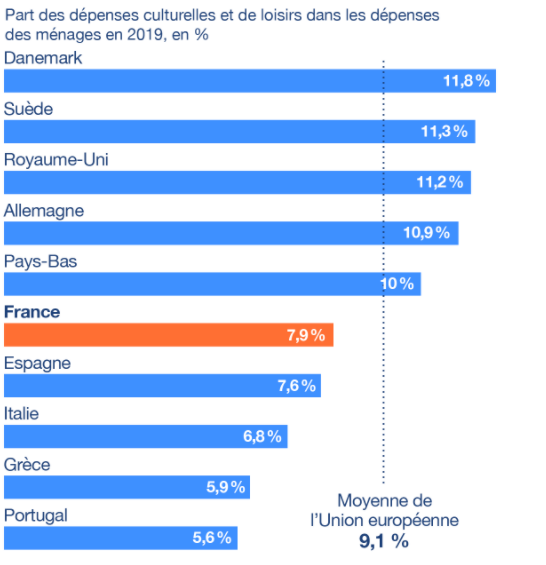 En 2019, la part des dépenses culturelles et de loisirs des Français dans leur budget était inférieure d’au moins trois points à celles des habitants du Danemark, de l’Allemagne ou de la Suède, selon une étude récente publiée par l’institut national de statistiques Insee, à partir des données de l’institut européen de statistiques Eurostat.