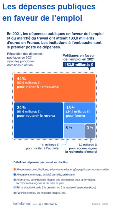 En 2021, les dépenses publiques en faveur de l’emploi et du marché du travail se sont élevées à 183,8 milliards d’euros en France, soit 7,3 % du PIB du pays, selon une récente étude de la Dares, le service des statistiques du ministère du Travail. Ces dépenses sont en recul de 3 % en euros constants par rapport à 2020, mais demeurent nettement supérieures à leur niveau d’avant la pandémie de Covid-19 (6,3 % du PIB en 2019).Les politiques publiques en faveur de l’emploi et du marché du travail se répartissent entre cinq principaux moyens d’action. Que ce soit avant ou après la pandémie de Covid-19, les incitations à l’embauche représentent le principal poste (44 % des dépenses en 2021). Ce levier consiste à abaisser le coût du travail pour l’employeur par exemple avec des allègements de cotisations sociales ou avec des contrats aidés. Le deuxième poste de dépenses est le soutien du revenu du travailleur en cas de perte d’emploi (pour l’aider à en retrouver un) ou de réduction d’activité (34 % des dépenses). Ce volet comprend les allocations chômage ou le chômage partiel.Les dépenses sont nettement moindres pour les trois autres postes, à savoir la formation, l’accompagnement des personnes en recherche d’emploi et l’incitation à l’activité. Ce dernier volet comprend toutes les mesures mises en place pour inciter les personnes à retrouver un travail, comme la prime d’activité. Il n’intègre pas le RSA , une allocation qui se situe « à la frontière du champ emploi et social », explique la Dares dans son étude.