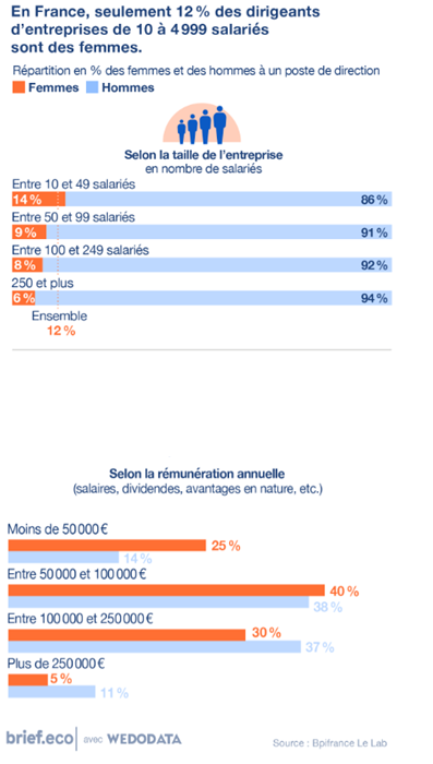 En France, seulement 12 % des dirigeants de PME et d'ETI, soit les entreprises de 10 à 4 999 salariés, sont des femmes, selon une étude récente de Bpifrance Le Lab. Le Lab est le cercle de réflexion de Bpifrance, une banque publique d’investissement française au service du financement et du développement des entreprises. « Ce chiffre étonne tant il est faible par rapport au taux de féminisation de certaines professions, comme les médecins ou les ingénieurs », souligne Bpifrance Le Lab.Cette étude est la première à se concentrer sur les dirigeantes de PME et d’ETI françaises, en excluant les TPE (moins de 10 salariés). Elle révèle que les femmes investissent exactement les mêmes secteurs d’activité que les hommes, c’est-à-dire principalement les services aux entreprises, l’industrie et le commerce. « Cela va à l’encontre de l’idée reçue » selon laquelle les femmes s’orientent surtout « vers les services à la personne et la santé », précise l’étude.Elle montre par ailleurs que les dirigeantes se rémunèrent moins que les dirigeants, même lorsqu’elles ont la pleine maîtrise de leur politique de rémunération. Alors que les rémunérations des dirigeantes et des dirigeants sont comparables lorsqu’ils n’ont pas d’enfant, un écart apparaît « dès lors que la dirigeante a un ou plusieurs enfants », note l’étude. Elle ajoute que cet écart se réduit lorsque les dirigeantes se retrouvent à la tête de familles monoparentales.