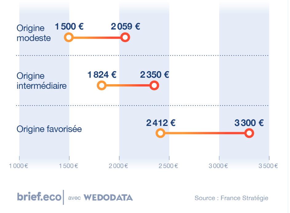 L’origine sociale des personnes est le principal facteur de l’inégalité des chances, selon une étude récente publiée par France Stratégie, un organisme d’études et de prospective qui dépend du Premier ministre. Pour parvenir à cette conclusion, France Stratégie a évalué l’inégalité des chances en se basant sur le niveau de revenus obtenu à l’âge adulte. Elle a analysé quatre caractéristiques susceptibles d’influencer la trajectoire des individus : l’origine sociale évaluée selon la profession des parents, le genre, l’endroit où ils ont grandi ainsi que le fait d’avoir ou non des parents immigrés. L’étude a évalué l’effet de chacune de ces caractéristiques, en neutralisant à chaque fois l’effet des autres, sur les revenus. Elle en conclut que l’écart entre ceux ayant les revenus les plus faibles et ceux ayant les revenus les plus élevés est principalement lié à l’origine sociale (1 100 euros d’écart en moyenne). Le genre est le deuxième facteur, avec 600 euros d’écart. Le « territoire de jeunesse » est le troisième facteur, devant l’ascendance migratoire. « Les écarts de revenus entre origines sociales sont d’abord liés à des parcours éducatifs différents, notamment au diplôme obtenu », précise France Stratégie. Les écarts de revenus entre femmes et hommes s’expliquent par leurs situations professionnelles (caractéristiques du poste et de l’entreprise, temps de travail, etc.), mais aussi par la naissance des enfants. Elle est à l’origine de « près de 60 % des écarts de revenus entre hommes et femmes ».