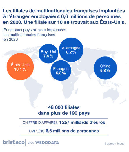 Une firme multinationale française est « un groupe de sociétés dont le centre de décision est situé en France et qui contrôle au moins une filiale à l’étranger », selon la définition de l’Insee. En 2020, la moitié des filiales de multinationales françaises étaient implantées dans neuf pays, le premier étant les États-Unis, où se trouvaient 4 900 filiales, soit 10,1 % du total, suivis par l’Allemagne, le Royaume-Uni, la Chine et l’Espagne.Les filiales de multinationales françaises employaient 6,6 millions de personnes en 2020, en premier lieu aux États-Unis (682 000 salariés), puis au Brésil et en Inde. Suivaient des pays européens : l’Allemagne, le Royaume-Uni et l’Espagne. Au total, l’effectif des filiales a augmenté de 20 % en cinq ans.