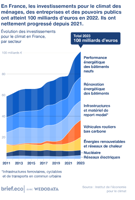 En France, les investissements pour le climat des ménages, des entreprises et des pouvoirs publics ont atteint 100 milliards d’euros en 2022, selon un bilan publié récemment par l’Institut de l’économie pour le climat (I4CE), un cercle de réflexion français. Ils s’élevaient à 61 milliards d’euros 10 ans plus tôt. Ces investissements ont nettement progressé depuis 2021, principalement grâce au plan de relance lancé par le gouvernement fin 2020.Les investissements pour le climat répertoriés par l’I4CE regroupent les sommes investies dans la rénovation des logements, les achats de véhicules électriques, les énergies renouvelables ou encore les infrastructures ferroviaires, cyclables et de transports en commun urbains. L’étude montre que les pouvoirs publics (État, collectivités territoriales, banques publiques, etc.) financent un tiers des dépenses réalisées en 2022, les deux tiers restants sont donc pris en charge par les ménages et les entreprises.L’I4CE prévoit une nouvelle hausse des financements pour le climat en 2023, à 108 milliards d’euros. « Or, pour atteindre nos objectifs climat », soit une réduction de 50 % des émissions brutes de gaz à effet en 2030 par rapport à 1990, « il faudra investir nettement plus dans les prochaines années », prévient l’institut. Il estime nécessaire d’investir chaque année, entre 2024 et 2030, au moins 58 milliards d’euros supplémentaires, principalement dans la rénovation énergétique des bâtiments, les véhicules électriques et le réseau ferroviaire.