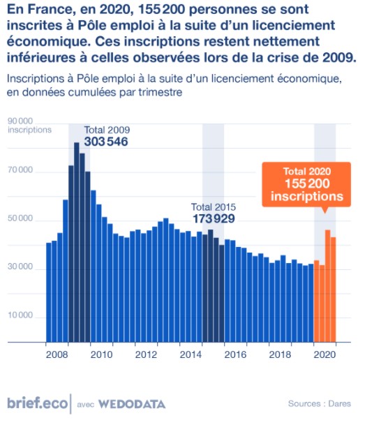 Il lie cette progression à « un contexte économique marqué par la crise sanitaire du Covid-19 ». Si les inscriptions pour licenciement économique retrouvent leur niveau de mi-2015, elles restent nettement inférieures à celles observées lors de la crise économique et financière de 2009.Un licenciement pour motif économique est un licenciement effectué par un employeur pour des raisons qui ne sont pas liées au salarié lui-même. Selon le Code du travail, l’entreprise peut y recourir si elle est confrontée à « des mutations technologiques », à une réorganisation « nécessaire à la sauvegarde de sa compétitivité », à « des difficultés économiques sérieuses » ou à la cessation de son activité.