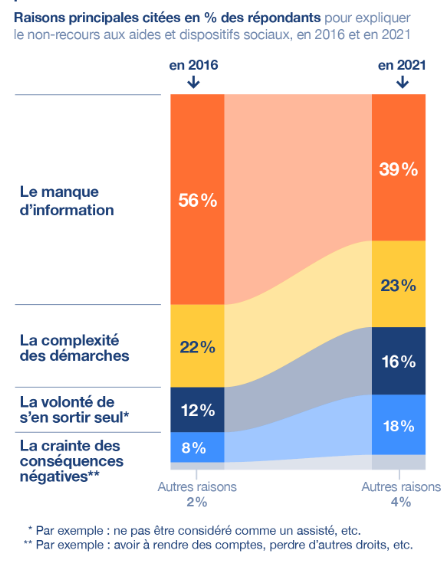L’enquête sur les raisons du non-recours a été menée auprès de 4 000 personnes résidant en France métropolitaine, qu’elles soient éligibles ou non aux prestations sociales. Près de quatre personnes interrogées sur 10 mettent en avant le manque d’information quant aux aides ou aux organismes à qui s’adresser. La seconde raison la plus avancée pour expliquer le non-recours est la complexité des démarches (23 %), suivie par la crainte des conséquences négatives, comme le fait de devoir rendre des comptes (18 %) et le souhait de s’en sortir soi-même sans dépendre de l’aide sociale (16 %). Le versement automatique des prestations sociales était une promesse de campagne d’Emmanuel Macron. Pour réduire le non-recours aux droits sociaux, le ministre des Solidarités, Jean-Christophe Combe, a annoncé le lancement cet été d’une expérimentation de trois ans dans une dizaine de territoires. Elle consiste notamment à mettre en œuvre des actions pour détecter les personnes éligibles et les accompagner dans leurs démarches.