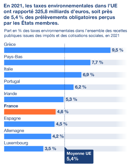 En 2021, les taxes environnementales dans l’UE ont rapporté 325,8 milliards d’euros, retrouvant leur niveau d’avant la pandémie de Covid-19, selon une étude récente de l’institut européen de statistiques Eurostat. Les taxes environnementales comprennent les taxes sur les produits énergétiques (charbon, électricité, etc.), les transports, la pollution et les ressources (émissions de gaz polluants comme les NOx, extractions de matières premières, etc.). Les taxes sur le CO2, comme la taxe carbone, sont incluses dans les taxes sur les produits énergétiques. La fiscalité environnementale a pour objectif de renchérir le coût des activités génératrices de pollution et d’atteintes à l’environnement afin d’inciter les ménages et les entreprises à modifier leurs comportements. En 2021, les taxes environnementales dans l’UE ont représenté 5,4 % du total des recettes publiques provenant des impôts et des cotisations sociales. Cette part variait selon les États membres, allant de 3,5 % au Luxembourg à 9,5 % en Grèce. Elle était en France inférieure à la moyenne de l’UE (4,6 %). En 2011, la Commission européenne, codétentrice du pouvoir exécutif de l’UE avec les États membres, avait demandé aux États membres d’augmenter d’ici 2020 la part des taxes environnementales dans les recettes publiques. « Aucun progrès majeur n’a été réalisé », selon Eurostat. Il note qu’en 2020, la part des taxes sur le travail dans les recettes publiques était de 53,5 %, un niveau près de 10 fois supérieur à la part des taxes environnementales.
