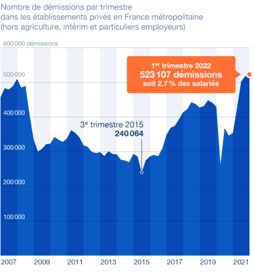 Au premier trimestre, plus de 520 000 démissions ont été enregistrées en France métropolitaine dans le secteur privé (hors agriculture, intérim et employeurs particuliers), selon une étude récente de la Dares. Le précédent record remontait au premier trimestre 2008, avec 510 000 démissions. À 2,7 % au premier trimestre, le taux de démission, c’est-à-dire le nombre de démissions rapporté au nombre de salariés, approche le niveau atteint en 2008.La hausse du taux de démission est liée à la reprise économique ayant suivi la crise du Covid-19. « Durant les phases d’expansion économique, de nouvelles opportunités d’emploi apparaissent, incitant à démissionner plus souvent », explique la Dares.