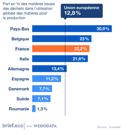 En 2020, le « taux d’utilisation circulaire de matières » de l’UE était de 12,8 %, selon une récente étude d’ Eurostat. Ce taux mesure la part des matières issues des déchets dans celles utilisées globalement pour produire des biens. Le terme « circulaire » fait référence à l’économie circulaire, un modèle fondé sur la réutilisation ou le recyclage des produits afin de limiter l’utilisation des ressources naturelles, l’accumulation de déchets et les dommages sur l’environnement.Dans l’UE, le taux d’utilisation circulaire de matières, également appelé taux de circularité, a progressé de 0,8 point par rapport à 2019 et de 4,5 points par rapport à 2004, première année pour laquelle ces données sont disponibles. En 2020, les matières les plus réutilisées sont les produits d’origine végétale ou animale tels que le papier et les tissus (10 %), les minéraux non métalliques comme le verre (16 %) et les métaux (25 %).En 2020, le taux de circularité est le plus élevé en France (22,2 %), en Belgique (23 %) et aux Pays-Bas (30,9 %), tandis qu’il est le plus faible en Roumanie (1,3 %). En France, la loi anti-gaspillage pour une économie circulaire, promulguée en février 2020, impose un taux minimal obligatoire de matière recyclée pour certains produits et matériaux. Un décret fixe par exemple un taux d’incorporation minimum de plastique recyclé de 25 % en 2025 pour les bouteilles en plastique d’un certain type (PET).