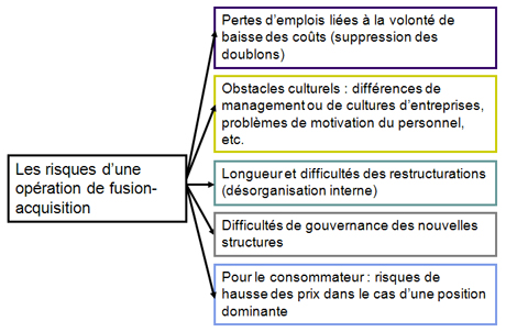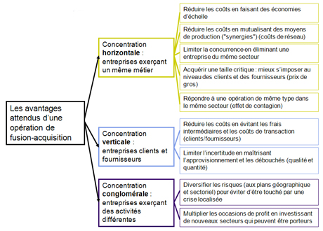 - La concentration des entreprises est la croissance moyenne de la taille des entreprises dans une économie ou un secteur d’activité donné. Cette concentration peut être le résultat de deux types d’opérations : opération de croissance interne si une entreprise crée une structure de production nouvelle, croissance externe si elle absorbe ou se jumelle avec des structures de production existantes. Une fusion crée une entité nouvelle avec des entités anciennes, tandis qu’une acquisition voit la disparition d’une entité au profit d’une autre.