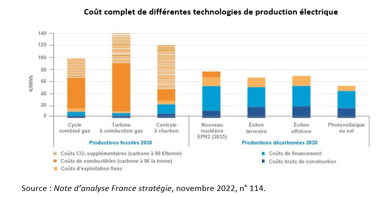 A moyen terme (2030), il faut investir dans les technologies déjà fiables. Or, investir dans un barrage, une centrale nucléaire, un champ d’éoliennes ou encore une ferme solaire, requiert un capital important, tout en permettant de bénéficier en contrepartie d’un coût d’exploitation faible (voir graphique ci-dessous). Si cet investissement supplémentaire stimule la demande, il a cependant tendance à réduire l’offre, parce qu’il dévalorise aussi bien du capital matériel (équipements, bâtiments) que du capital immatériel (brevets) et humain (qualifications). Cette réduction de l’offre risque de générer des tensions inflationnistes, de même qu’une diminution de la productivité du travail. La croissance risque donc d’être temporairement réduite.