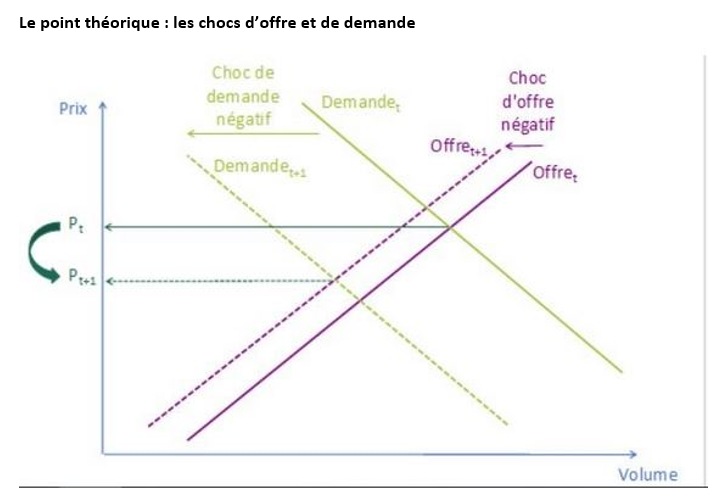 Un choc de demande positif déplace la courbe de demande vers la droite, ce qui augmente le niveau des prix. Un choc de demande négatif réduit le niveau des prix. Les ajustements de l’offre (toujours en fonction du niveau de l’élasticité) permettent ensuite de trouver un nouvel équilibre.