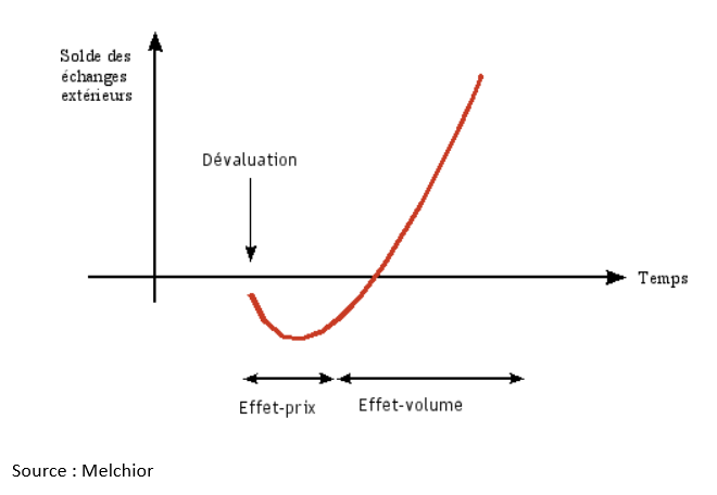 La courbe en J (voir ci-dessous) décrit un mécanisme d’ajustement temporel dans lequel la balance commerciale d’un pays de détériore immédiatement après la dépréciation de sa monnaie (effet-prix), et ne s’améliore que quelque temps plus tard car les exportations augmentent en volume, de même que les importations baissent en volume. Mais les effets-volumes ne jouent pas tout de suite alors que les effets-prix sont immédiats.