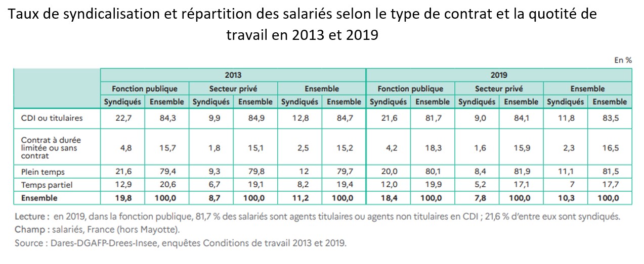 Léger repli de la syndicalisation en France entre 2013 et 2019, publiée en février 2023, sous la signature de Maria Thérèsa Pignoni