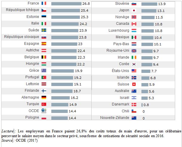 Il est aujourd’hui accepté que l’emploi des personnes peu qualifiées est particulièrement sensible au coût du travail. Le coût total de l’embauche pour une entreprise est encore souvent supérieur à ce que lui rapporterait un salarié peu productif car peu qualifié (80% des chômeurs ont au mieux le baccalauréat). Les estimations révèlent en moyenne pour la France qu’une baisse de 1% du coût du travail se traduit par une hausse de l’emploi de 1%. Baisser le coût du travail au niveau des salaires les plus bas revient alors à supprimer une barrière à l’emploi des moins diplômés, notamment dans le secteur des services aux personnes et aux entreprises. Les cotisations de sécurité sociale employeur demeurent élevées en France par rapport aux autres pays de l’OCDE (cf Tableau 2) malgré la multiplication des mesures pour le diminuer sur les bas salaires (allègements généraux sur les bas salaires, crédit d’impôt pour la compétitivité et l’emploi, et baisse des cotisations familiales du Pacte de responsabilité). Il reste encore aujourd’hui près de 6 points d’allègement potentiel pour que le SMIC brut représente l’équivalent du coût du travail pour l’employeur. Une diminution du coût du travail est donc encore possible, qui pourrait s’accompagner de la fusion des différents dispositifs (le CICE se transformant en baisse de cotisations patronales pérenne) et d’un ciblage plus fin sur les salaires les plus bas. De plus, il semble souhaitable d’augmenter le point de sortie des allègements de 1,6 à 1,9 SMIC afin d’éviter les trappes à bas salaires.
