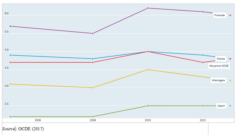 La France produit des efforts notables dans le domaine de l’éducation, notamment en termes budgétaires. Elle consacre en 2013 4,8% de son PIB aux dépenses publiques d’éducation, chiffre proche de la moyenne des pays de l’OCDE (cf Graphique 2), soit beaucoup plus que le Japon (3,5%) mais beaucoup moins que la Finlande (6%). Cependant, les résultats sont loin d’être probants pour les élèves les plus en difficulté, soit près de 1 sur 5. Les tests du programme international de l’OCDE pour le suivi des acquis des élèves (PISA) font état de résultats moyens pour la France qui s’expliquent par des inégalités fortes et une part importante d’élèves en difficulté. Près de 110 000 élèves quittent le système scolaire sans diplôme chaque année en moyenne (les derniers chiffres font néanmoins état d’une baisse en dessous de 100 000).