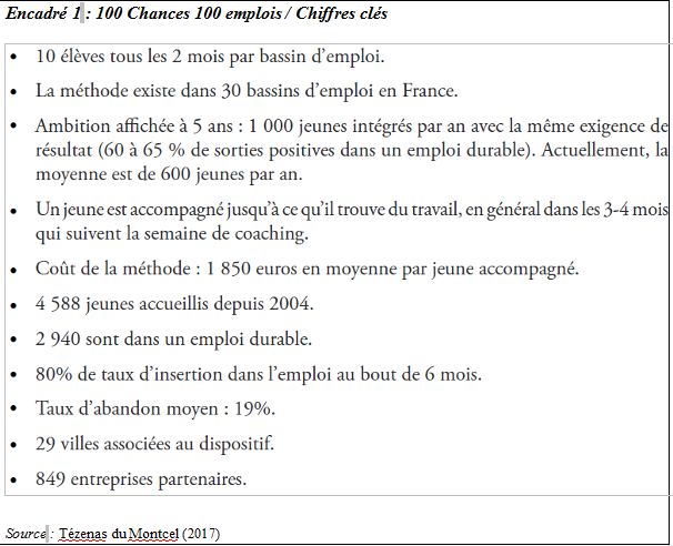 En attendant une amélioration de la mobilité géographique des personnes au chômage dans les quartiers défavorisés, d’autres actions peuvent être menées de manière à les aider à trouver un emploi là où ils vivent, ou pas très loin. L’initiative 100 Chances 100 Emplois, née en 2004, s’inscrit dans ce cadre (Tézenas du Montcel 2017). Elle consiste à « miser sur les acteurs locaux des bassins d’emploi, publics ou privés, sur leur connaissance du terrain, des vrais besoins des entreprises, qu’elle mobilise pour accompagner et guider vers l’emploi des jeunes de tous niveaux et réellement motivés ». L’objectif est de permettre à des jeunes de moins de 30 ans de trouver un emploi ou une formation qualifiante. La méthode consiste tout d’abord à repérer en amont des jeunes particulièrement éloignés de l’emploi puis à sélectionner un groupe qui pourra évoluer ensemble dans le cadre d’une semaine de travail puis plus tard rester en relation. Le groupe est alors encadré par un coach à plein temps et le pilote/entreprise responsable de la dynamique entrepreneuriale locale. Durant la semaine de travail, les jeunes vont notamment être confrontés à des simulations d’entretiens et rencontrer des cadres d’entreprises, dans le but de formaliser un projet professionnel et d’acquérir des savoir-être utiles au moment de l’entretien d’embauche. L’idée est de redonner à ces jeunes l’estime d’eux-mêmes, de leur permettre d’accéder à un réseau professionnel et d’acquérir une méthode de recherche d’emploi efficace. La dernière étape est celle lors de laquelle les jeunes opèrent effectivement leur insertion professionnelle, via des entretiens d’embauche, des missions d’intérim, des stages tout en continuant à être accompagnés par les représentants d’entreprises participant au dispositif. Le financement des différentes actions repose sur cotisation annuelle payée par une dizaine d’entreprise dont Schneider Electric à l’origine du projet, sur un soutien de la fondation Agir pour l’insertion de l’UIMM et sur des aides publiques diverses dont celles relevant de la politique de la ville, des régions, des collectivités locales ou du fonds social européen (FSE). La méthode fonctionne et n’est finalement pas très coûteuse (cf Encadré 1) : 4 jeunes sur 5 participants au projet trouvent un emploi au bout de 6 mois, ce qui économise allocations chômage ou minima sociaux. Le projet a le mérite de favoriser les échanges entre les différents acteurs locaux de l’emploi, publics et privés, et ce de manière durable. Cependant, il présente quelques limites. La taille humaine des promotions ne permet pas de toucher un grand nombre de jeunes en difficulté et le manque d’entreprises partenaires peut être un frein. Comme le reconnaissent les acteurs du projet, les jeunes qui bénéficient effectivement de l’encadrement ne sont pas forcément ceux qui sont le plus éloignés de l’emploi ; ceux sortis sans diplômes du système scolaire ne sont pas, de fait, la cible principale. Le projet a néanmoins le mérite d’exister et d’être efficace, et il pourrait en inspirer d’autres d’ampleur plus importante et mieux ciblés sur ceux qui en ont le plus besoin.