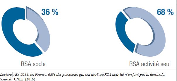 Le système, de par sa complexité, est peu lisible, et de nombreuses personnes ne bénéficient pas des droits auxquels elles pourraient prétendre. Différents facteurs coexistent et jouent un rôle plus ou moins important selon les dispositifs pour expliquer le non-recours : les règles d’éligibilité et les procédures d’inscription longues et complexes rendent l’accès à l’information difficile, la stigmatisation en tant « qu’assistés », le problème de domiciliation pour certains publics en grande difficulté ou la coordination imparfaite des institutions concernées constituent un frein à l’accès au public-cible. Le RSA, dispositif dont le taux de non-recours est le moins mal documenté, en présente un élevé (cf Graphique 3) mais dans la moyenne des autres pays européens. Le non-recours réduit l’effet potentiel du dispositif de baisse de la pauvreté et, de plus, nuit à la précision du pilotage budgétaire (un changement de comportement non anticipé peut induire un écart de plusieurs milliards d’euros).