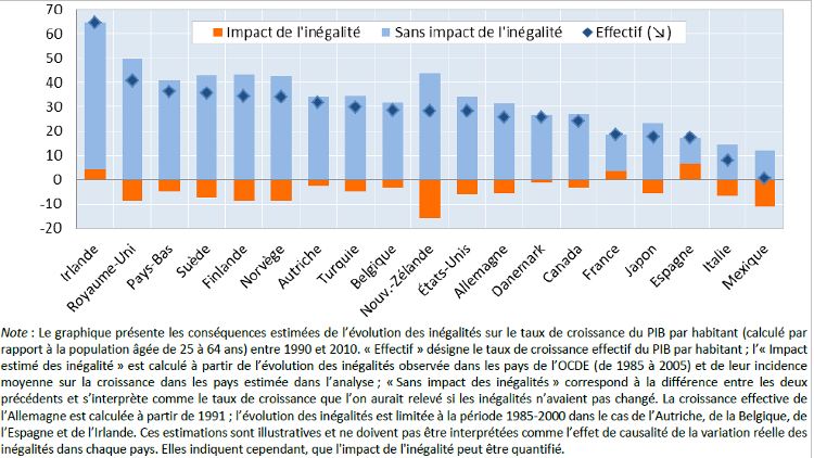 L’organisation de coordination et de développement économique (OCDE) a récemment révélé à travers une étude que toute amplification des inégalités économiques faisait chuter la croissance économique. « Une aggravation des inégalités de 3 points de Gini — soit la moyenne des pays de l’OCDE pour les vingt dernières années — ferait perdre 0.35 point de croissance par an sur 25 ans, soit une perte cumulée de PIB de 8.5 % à terme. » (OCDE 2014). Pour la plupart des pays, le taux de croissance du PIB entre 1990 et 2010 aurait été meilleur si les inégalités de revenu n’avaient pas évolué entre 1985 et 2005 (cf Graphique 1 ; impact de l’inégalité négatif pour 16 pays sur 19).