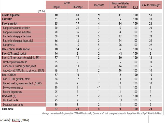 - Cereq (2014) : Quand l’école est finie. Premiers pas dans la vie active de la génération 2010, Enquête 2013, Centre d’études et de recherche sur les qualifications