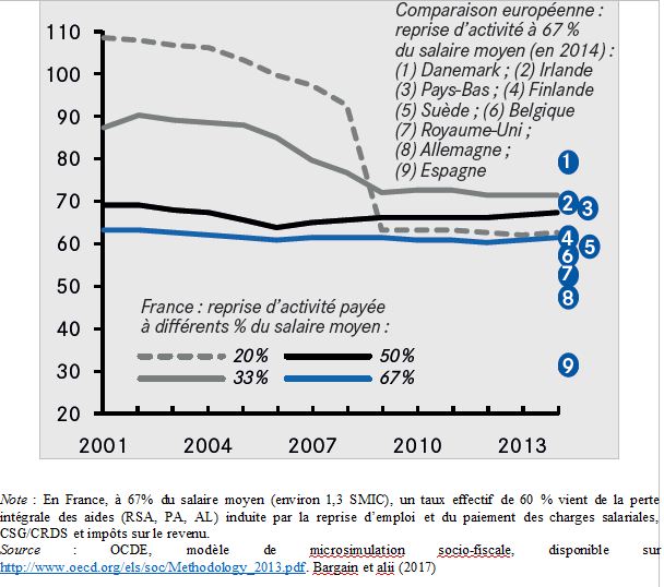 Outre des mesures réduisant le non-recours, une amélioration des incitations au travail pourrait aussi favoriser l’accès à l’emploi et réduire à terme la pauvreté. Pour être incité à reprendre un emploi, il faut que cette reprise « paye », c’est-à-dire que son coût d’opportunité soit relativement faible. Pour cela, le gain net doit être positif : le nouveau revenu d’activité doit compenser la perte d’une partie ou de la totalité des aides sous conditions de ressources, le paiement des cotisations sociales et de la CSG/CRDS, et le paiement de l’impôt sur le revenu le cas échéant. En France, le gain net se situe dans la moyenne européenne. Pour une personne célibataire reprenant un emploi rémunéré à hauteur de 1,3 SMIC, le gain net représente environ 40% de ce revenu ; le taux effectif d’imposition est par conséquent de 60% (cf Graphique 4). Une réduction de ce taux d’imposition diminuerait le risque de désincitation au travail. Les études montrent que les jeunes en marge du marché du travail, les outsiders, sont les principales victimes de cette désincitation à la reprise d’emploi. Pour certains parents isolés, il peut aussi être rationnel de ne pas accepter un emploi en raison des coûts de garde d’enfants, comme ceux de la crèche lorsqu’ils y trouvent une place. Il est donc efficace de cibler ces types de publics.