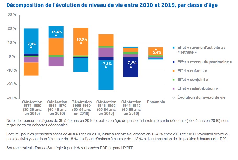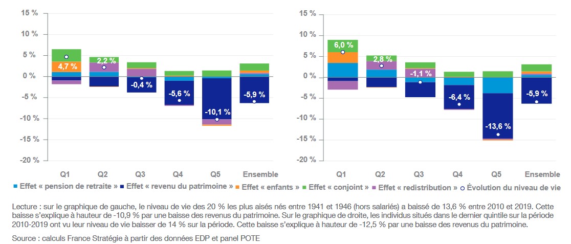 Autre enseignement de l’étude : au sein de la cohorte des jeunes actifs, soit les personnes nées entre 1971 et 1980, le rapport du niveau de vie moyen des 20% les plus aisés et celui des 20% les plus modestes (écart interquintile) est de 4,1 en 2019 alors qu’il était de 3,9 en 2010. Cela s’explique par la dynamique des revenus d’activité. En revanche, au niveau des retraités, donc les personnes nées entre 1941 et 1945, on observe que les niveaux de vie ont progressé pour les bas revenus, qu’ils ont stagné aux alentours de la médiane, et qu’ils ont baissé pour les hauts revenus. Le recul des ménages aisés s’explique avant tout par une chute de leurs revenus d’épargne, dans un contexte de bas taux d’intérêt sur la période (baisse des revenus du patrimoine).