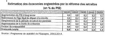 Autre aspect essentiel visé par les réformes : les retraites. En 2011, le gouvernement espagnol a approuvé un ensemble de mesures visant à renforcer la viabilité future des retraites. Les dispositions consistent à relever de 2 ans l’âge légal de départ à la retraite de 65 ans à 67 ans graduellement de 2013 à 2027, à reconnaître les carrières longues, à durcir les conditions d’accès à la retraite anticipée (le seuil d’entrée dans le dispositif passe de 61 ans à 63 ans), à élargir la période de calcul du niveau des pensions de retraite des 15 dernières années aux 25 dernières années, à augmenter la durée de cotisations (de 35 à 37 ans), à augmenter les incitations à la prolongation d’activité, et à introduire un facteur de soutenabilité selon lequel jusqu’en 2027 les principaux paramètres seront actualisés tous les 5 ans en fonction des gains d’espérance de vie. Selon les estimations en vigueur, cette réforme pourrait entraîner une économie d’environ 3,5%du PIB en 2050.