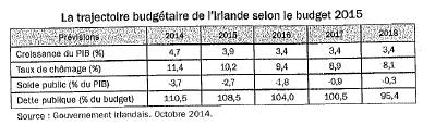 Le retour de la croissance nécessite d’abord d’assainir les finances publiques. En Irlande, le redressement budgétaire engagé depuis 2008 peut être considéré comme une réussite. L’Irlande a amélioré son solde primaire structurel (le solde primaire est le solde du budget des administrations publiques non compris les intérêts versés sur la dette et les revenus d’actifs financiers reçus ; le solde structurel est le solde qui ne tient pas compte de la conjoncture sur la situation des finances publiques) de 9% entre 2009 et 2004, et l’équilibre primaire est atteint pour 2014. Dans ces conditions, le solde public observé (qui additionne le solde structurel et le solde conjoncturel) devrait atteindre une position voisine de l’équilibre en 2018. Dès le 15 décembre 2013, le gouvernement irlandais est d’ailleurs officiellement sorti du programme d’assistance financière internationale.