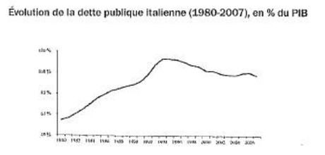 A la différence de l’Espagne et de l’Irlande, l’Italie a connu dans la décennie qui a précédé la crise de 2008 une croissance économique faible. Entre 1999 et 2007, la croissance annuelle moyenne du PIB italien s’est élevée à 1,6% par an, contre une moyenne de 2,2% pour la zone euro. Cette faible croissance est due pour l’essentiel à un manque de compétitivité de l’économie italienne, alors que celle-ci reposait jusqu’alors sur une base industrielle forte, tournée vers l’exportation. La dégradation de la compétitivité de l’Italie dans les années 1990 s’explique par la faiblesse des gains de productivité, qui s’explique elle-même par l’investissement insuffisant dans l’éducation et l’innovation (en 2012 encore, les dépenses de Recherche-Développement représentent 1,27% du PIB de l’Italie contre 2,17% dans la moyenne de la zone euro), et par les fortes rigidités sur le marché du travail et des biens. De plus, l’Italie aborde la crise avec des finances publiques très dégradées. Le poids des dépenses publiques était avant la crise relativement élevé en comparaison de la moyenne européenne (en 2007, l’Italie consacrait 47,6% de son PIB aux dépenses publiques, contre 45,8% en moyenne dans l’Union européenne à 15), et surtout le niveau de la dette est déjà excessif, fruit d’une gestion laxiste des finances publiques à partir des années 1980.
