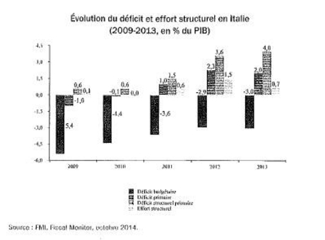 En tout cas, si l’Italie a ramené entre 2009 et 2013 son déficit budgétaire de 5,4% à 3% du PIB, si le déficit primaire a été résorbé en 2010, et si l’excédent structurel primaire est de 4%en 2013, cet effort apparaît insuffisant pour permettre une baisse durable et rapide de la dette publique.