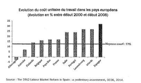 Elles concernent tout d’abord le fonctionnement du marché du travail. En Espagne, la réforme du marché du travail de 2010 avait pour objectif de donner plus de souplesse aux entreprises dans la gestion de leurs effectifs. Dans cette perspective, elle introduit une modification des règles d’embauche et de licenciement visant à réduire la dichotomie entre contrats à durée indéterminée (CDI) et contrats à durée déterminée (CDD), et à réduire notamment le coût du licenciement. Cette réforme s’accompagne de la modération salariale, particulièrement justifié par la forte progression du coût unitaire du travail en Espagne dans les années 2000.