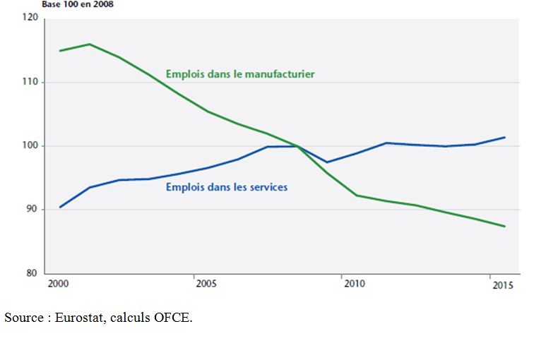 Depuis le début des années 2000, la France a perdu près d’un million d’emplois dans l’industrie. Mais alors que le secteur des services compensait ces pertes jusqu’à la crise, il ne crée plus que 150 000 emplois depuis (quand l’industrie en perd plus de 500 000 de 2008 à 2015), exacerbant le problème de la désindustrialisation (cf Graphique 2).