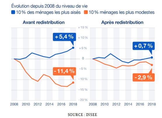 En 2018, en France, le niveau de vie des ménages après redistribution a évolué de façon contrastée entre les plus aisés et les plus modestes, selon une étude de l’INSEE publiée en mi-septembre dernier. Le niveau de vie après redistribution d’un ménage correspond à l’ensemble de ses revenus (activité, chômage, retraite, patrimoine) après paiement des impôts directs et perception des prestations sociales, divisé par le nombre de personnes qui le composent (pondérées en fonction de leur âge). Le niveau de vie est le même pour tous les individus d’un même ménage.
