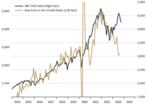 « Entre le 01 octobre 2022 et le 30 juillet 2023, les principaux indices boursiers ont connu 10 mois de bull market, gagnant 28% en moyenne. La situation semble s’être inversée depuis le 01 août 2023, le MSCI World All Countries, le S&P 500 et l’Euro Stoxx cédant tous les trois quelque -9%. Nous avons régulièrement détaillé le caractère atypique de ce marché haussier, nullement bâti sur des fondamentaux micro et macroéconomiques (figure 1), mais entièrement sur le regain de confiance prématuré des investisseurs et sur l’envolée temporaire des multiples de valorisation, comme lors du dégonflement de la bulle internet entre 2000 et 2002 (figure 2) ».