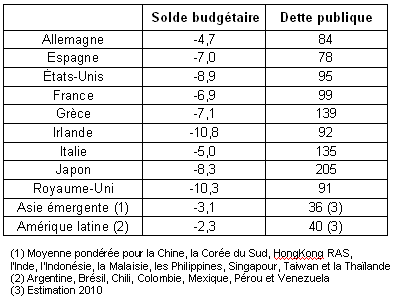 Ainsi, alors que l'Allemagne affichait un budget en excédent en 2007 (+ 0,7 % du PIB), le déficit public anticipé est proche de 5 % du PIB en 2011. Les bouleversements sont encore plus marqués pour un pays comme l'Espagne qui affichait un excédent budgétaire de 1,9 % du PIB en 2007 et dont le déficit prévu devrait dépasser 7 % en 2011. Le rapport souligne aussi les contrastes entre la situation budgétaire des pays de l'Union européenne et des États-Unis et celle des pays émergents. Ainsi, en moyenne, le poids des déficits et de la dette dans le Produit intérieur brut est deux à trois fois moindre dans les économies émergentes d'Asie ou d'Amérique latine que dans les vieux pays industrialisés.