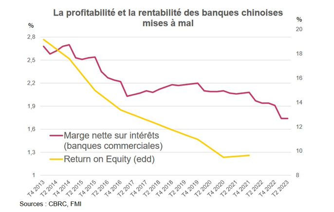 La première de ces fragilités est le fait que les marges monétaires apparaissent comme étant sous contraintes (voir le point d’éclaircissement ci-dessous). Les mesures de soutien à l’économie par la baisse de plusieurs taux de référence par la Banque centrale de Chine (PBoC) se heurtent à l’existence de conflits d’intérêts puisqu’elle reviendrait à favoriser une hausse de l’endettement (l’endettement des ménages et des entreprises atteint 246,7% du PIB), engendrerait un risque élevé de dépréciation du yuan, et réduirait la profitabilité du secteur bancaire.