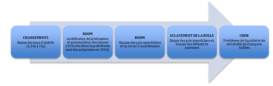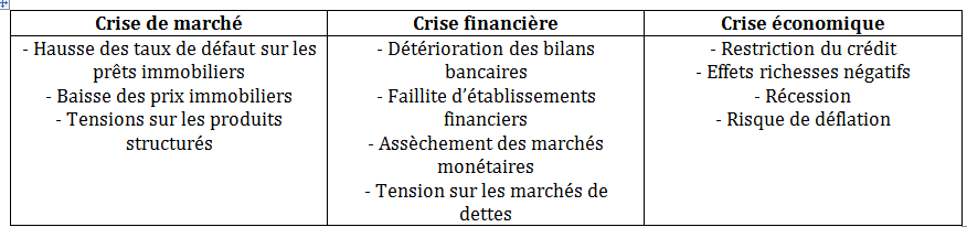 D’abord localisée sur le marché des crédits hypothécaires à risque (ou « subprime »), la crise s’est propagée via les produits structurés dans le bilan des établissements financiers menant à une crise financière dont l’aspect le plus spectaculaire fut les faillites de banques et les crises de refinancement sur les marchés monétaires à court terme. Cette crise bancaire a eu ensuite des répercussions macroéconomiques en restreignant le crédit aux entreprises et aux ménages et en réduisant la valeur des patrimoines.